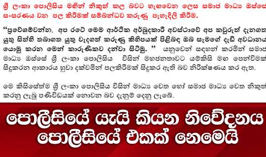 Read Moreශ්රී ලංකා පොලීසියේ යැයි හැගෙන අයුරින් නිකුත් කර මේ වන විට සමාජ මාධ්ය ජාල හරහා ප්රචාරය වන නිවේදනය පොලීසිය විසින් නිකුත් කළ නිවේදනයක් නොවන බව ශ්රි ලංකා පොලීසිය නිවේදනයක් නිකුත් කරමින් පවසයි.
