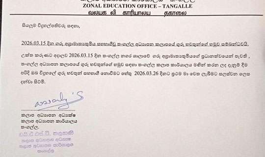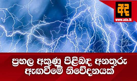Read Moreප්රභල අකුණු පිළිබ ඳ අනතුරු ඇ ඟ වීමේ නිවේදනයක් කාලගුණ විද්යා දෙපාර්තමේන්තුව විසින් නිකුත් කර තිබේ. සබරගමුව පළාත හා ගාල්ල, මාතර දිස්ත්රික්ක වෙනුවෙන් නිකුත් කළ මෙම නිවේදනය අද දහවල් 12ට සිට රාත්රී 11 තෙක් වලංගු වෙයි.