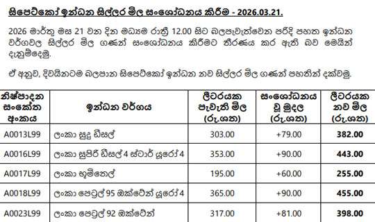 අද (21) මධ්යම රාත්රියේ සිට ක්රියාත්මක වන පරිදි ඉන්ධන මිළ ඉහළ දැමීමට ලංකා ඛණිජ තෙල් නීතිගත සංස්ථාව කටයුතු කර තිබේ.