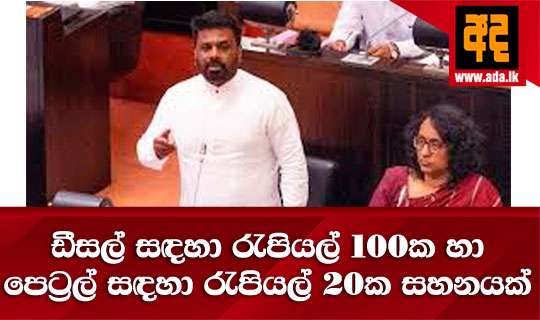 Read Moreජනාධිපති අනුර කුමාර දිසානායක විසින් පාර්ලිමේන්තුව අමතමින් සහන පැකේජයක් ඉදිරිපත් කිරීමේදී ඩීසල් හා පෙට්රල් සඳහා ද රජය විසින් සහන සලසන බව ප්රරකාශයට පත්කෙරිණි.