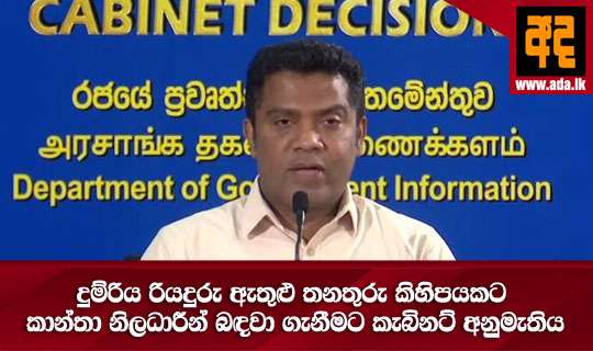 දුම්රිය එංජින් රියදුරු, දුම්රිය නියාමක, දුම්රිය ස්ථානාධිපති සහ දුම්රිය අධීක්ෂණ කළමනාකරු යන තනතුරු වලට කාන්තා නිලධාරීන් බඳවා ගැනීමට ප්රතිපත්තිමය වශයෙන් කැබිනට් මණ්ඩලයේ අනුමැතිය හිමි වූ බව කැබිනට් ප්රකාශක සෞඛ්ය සහ ජනමාධ්ය අමාත්ය වෛද්ය නලින්ද ජයතිස්ස මහතා පැවසීය.