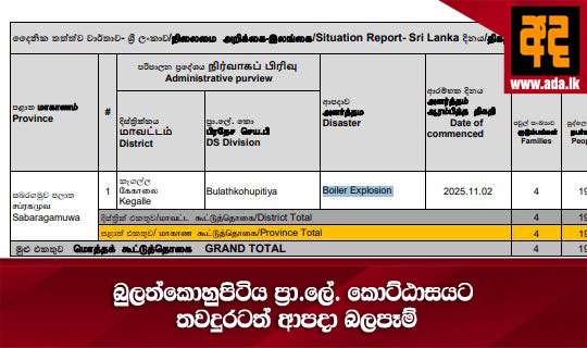 Read Moreකෑගල්ල දිස්ත්රික්කයේ බුලත්කොහුපිටිය ප්රාදේශීය ලේකම් කෝට්ඨාසයට තවදුරටත් අපදා තත්ත්වය හේතුවෙන් බලපෑම් තිබෙන බව ආපදා කළමනාකරණ මධ්යස්ථානය සඳහන් කරයි.