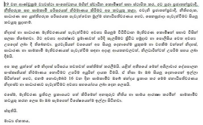 එම නිවේදනය පහත පරිදි වේ.