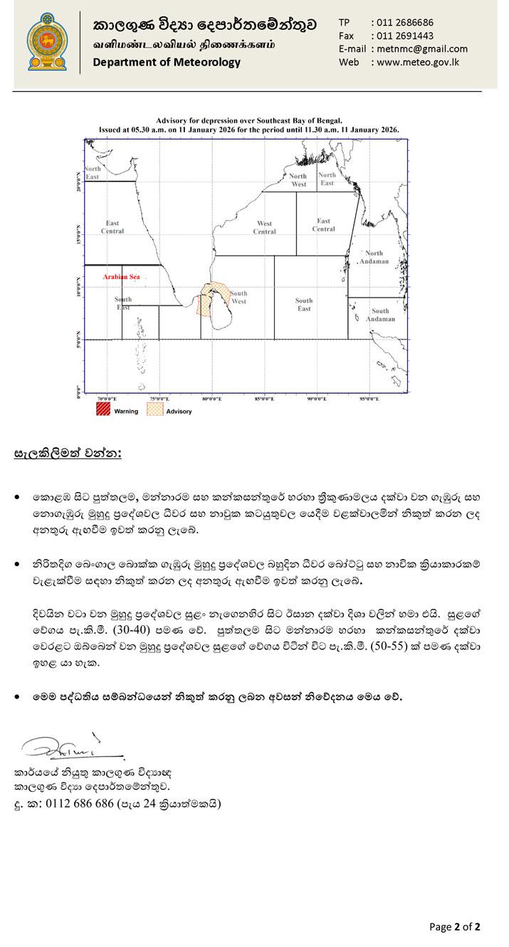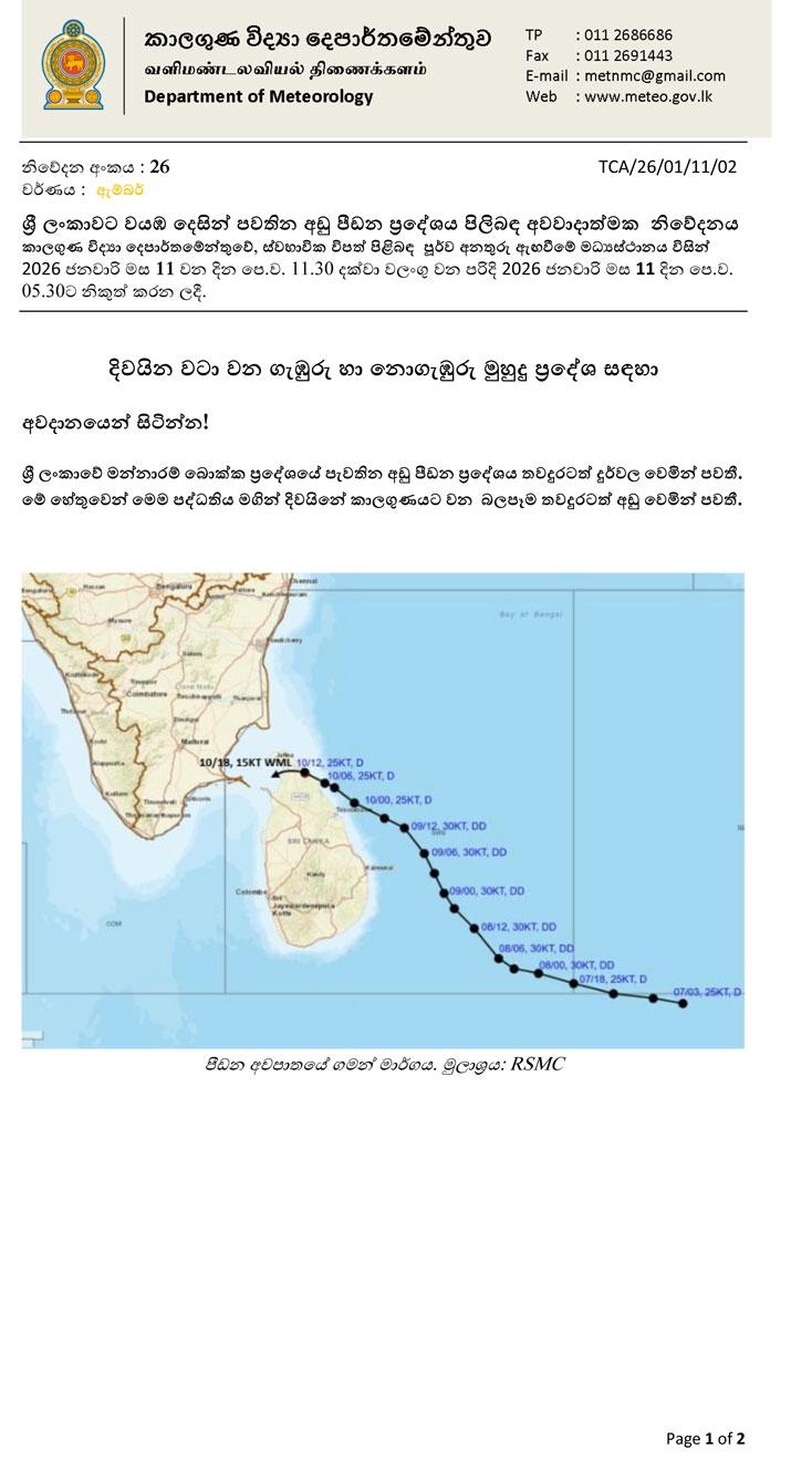 ශ්රී ලංකාවේ මන්නාරම බොක්ක ප්රදේශයේ පවතින අඩුපීඩන ප්රදේශය තවදුරටත් දුර්වල වෙමින් පවතින බව කාලගුණ විද්යා දෙපාර්තමේන්තුව පවසයි. එම දෙපාර්තමේන්තුව අද පෙරවරුවේ නිකුත් කළ නිවේදනයේ දැක්වෙන්නේ එම පද්ධතිය මගින් දිවයිනේ කාලගුණයට වන බලපෑම තවදුරටත් අඩුවෙමින් පවතින බවයි.