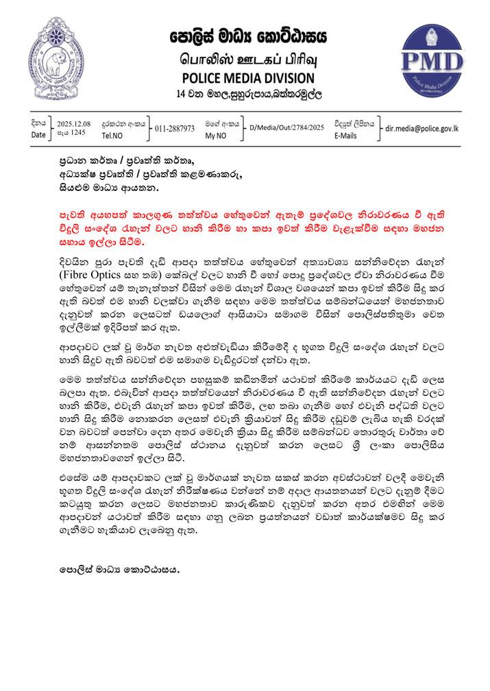 පැවැති අයහපත් කාලගණ තත්ත්වය හේතුවෙන් ඇතැම් ප්ර දේශවල නිරාවරණය වි ඇති විදුලි සංදේශ රැහැන් වලට හානි කිරී හා කපා ඉවත් කිරීම වැළැක්වීම ඳසහා පොලීසිය මහජන සහාය ඉල්ලා සිටියි.
