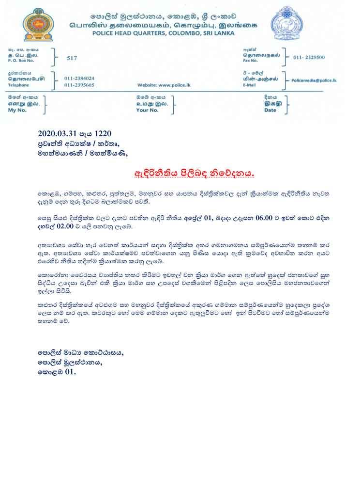 කොළඹ, කලුතර,ගම්පහ, යාපනය, මහනුවර හා පුත්තලම දිස්ත්රික්කවලට දිගටම ඇඳිරි නීතිය. සෙසු දිස්ත්රික්කවලට හෙට (01දා) පෙරවරු 6.00ට ඉවත් කරන ඇඳිරි නීතිය යළිත් පස්වරු 2.00ට පැනවීමට නියමිතය.
