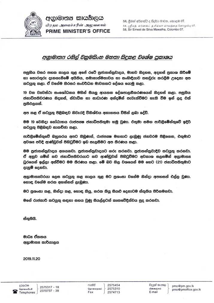 පාර්ලිමේන්තුවේ බහුතරයක් තිබුණත් ගෝඨාභය රාජපක්ෂ මහතාට ලැබුණු ජනවරම පිළිගෙන, ඔහුට අවශ්ය පරිදි ආණ්ඩුවක් පිහිටුවීමට ඉඩ සැලසීමට තීරණය කළ බවද අග්රාමාත්යවරයා ප්රකාශ කරයි.