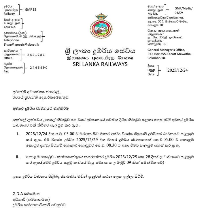 නත්තල් උත්සවය, පාසල් නිවාඩුව හා වසර අවසානයේ පවතින දීර්ඝ නිවාඩුව හේතුවෙන් අමතර දුම්රිය දෙකක් ධාවනයට ඒක්කිරිමට දුම්රිය දෙපාර්තමේන්තුව කටයුතු කර තිබේ.