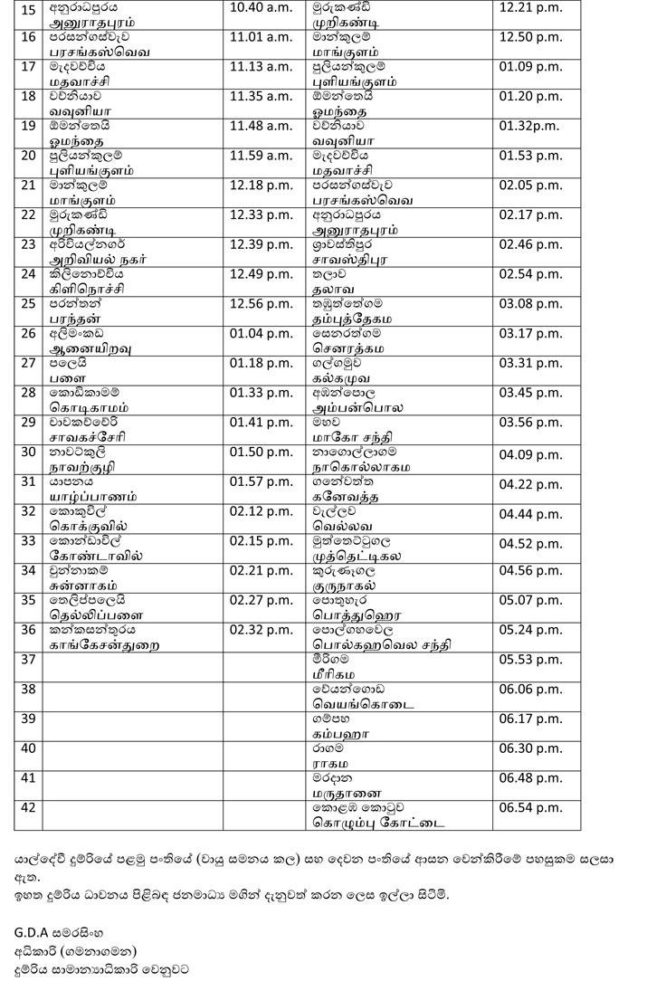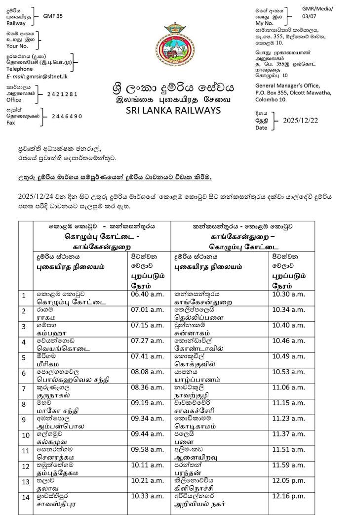 දිත්වා සුළි කුණාටුව හේතුවෙන් හානියට පත්වූ උතුරු දුම්රිය මාර්ගය මේ වන විට සම්පූර්ණයෙන්ම යළි ප්රතිසංස්කරණය කර තිබේ. ඒ අනුව කොළඹ කොටුවේ සිට කන්කසන්තුරය දක්වා දුම්රිය ධාවනය ආරම්භ කරන බව දුම්රිය දෙපාර්තමේන්තුව පවසයි.
