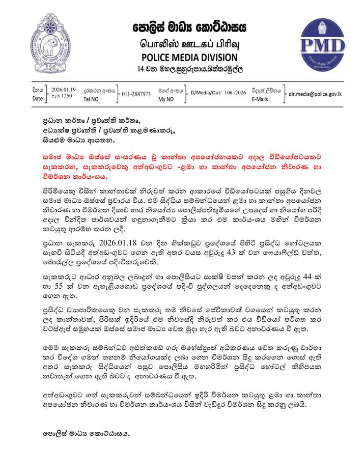 කාන්තාවක් නිරුවත් කර ඒම වීඩියෝව සමාජ මාධ්යයට මුදා හැරීමට සම්බන්ධ ව්යාපාරිකයා හා ඔහුට ආධාර අනුබල දුන් තවත් දෙදෙනෙක් පොලීසිය විසින් අත්අඩංගුවට ගෙන තිබේ.