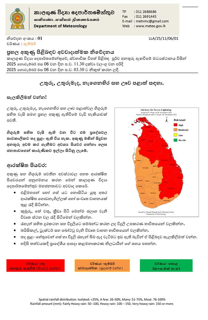 ප්රභල අකූණු පිළිබඳ අනතුරු ඇඟවීමේ නිවේදනයක් කාලගුණ විද්යා දෙපාර්තමේන්තුව විසින් නිකුත් කර තිබේ. අද පස්වරුවේ නිකුත් කළ මෙම නිවේදනය අද රාත්රී 11.30 තෙක් වලංගු වෙයි.