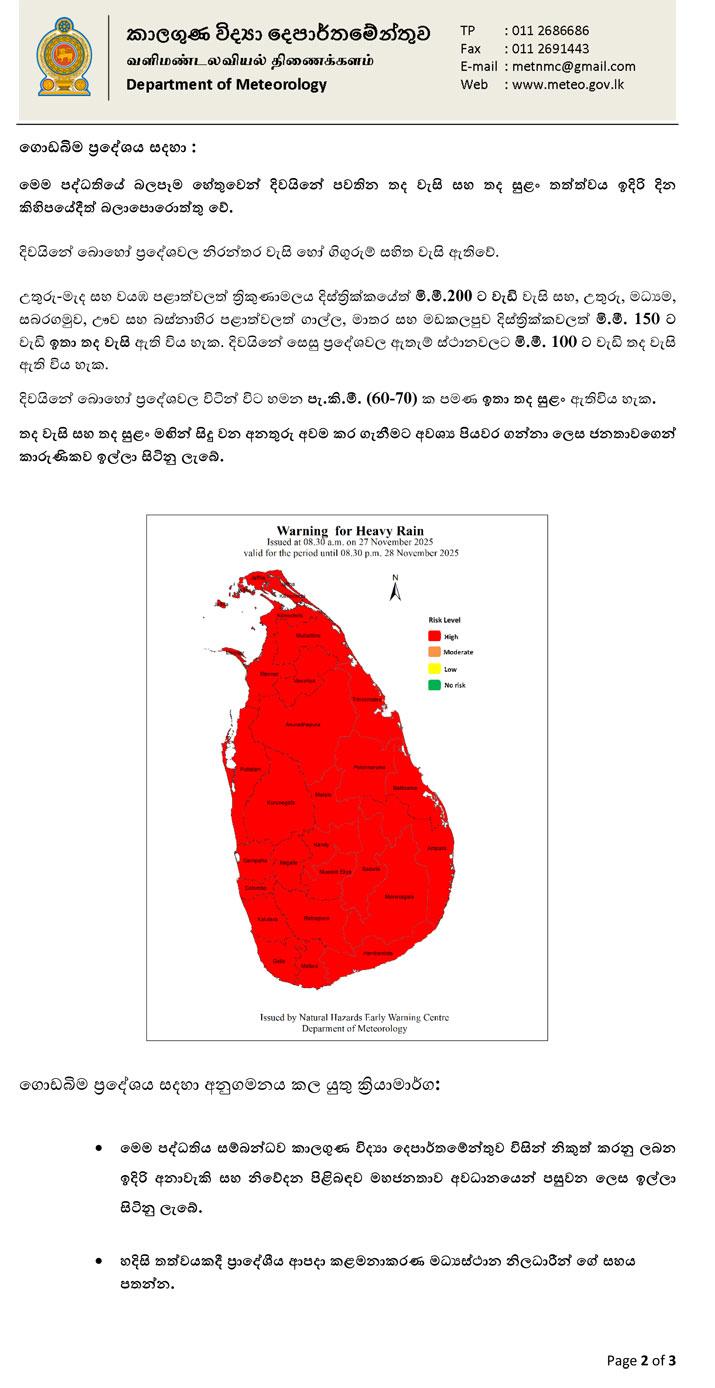 තද වැසි පිළිබඳව අවවාදාත්මක රතු නිවේදනයක් කාලගුණ විද්යා දෙපාර්තමේන්තුව විසින් නිකුත් කර තිබේ. එම නිවේදනය පහතින්.