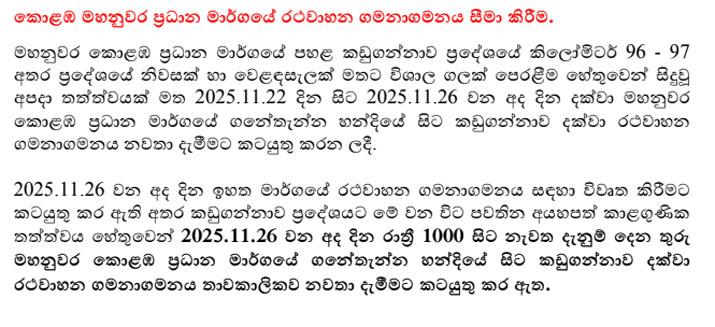 කොළඹ නුවර මාර්ගයේ ගනේතැන්න සිට කඩුගන්නාව දක්වා වූ මාර්ග කොටස යළිත් ඊයේ රාත්රී සිට නැවත දැනුම් දෙන තුරු තාවකාලිකව වසා දැමුණ බව පොලිස් මාධ්ය ප්රකාශක කාර්යාලය පවසයි.