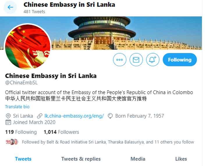 ශ්රී ලංකාවේ චීන තානාපති කාර්යාලයේ ට්විටර් ගිණුමට පිවිසිමේ අවස්ථාව ට්විටර් පාලනාධිකාරිය කටයුතු කළත් මේ වන විට නැවතත් ගිණුම සක්රීය කිරිමට ට්විටර් පාලනාධිකාරිය කටයුතු කර තිබේ.