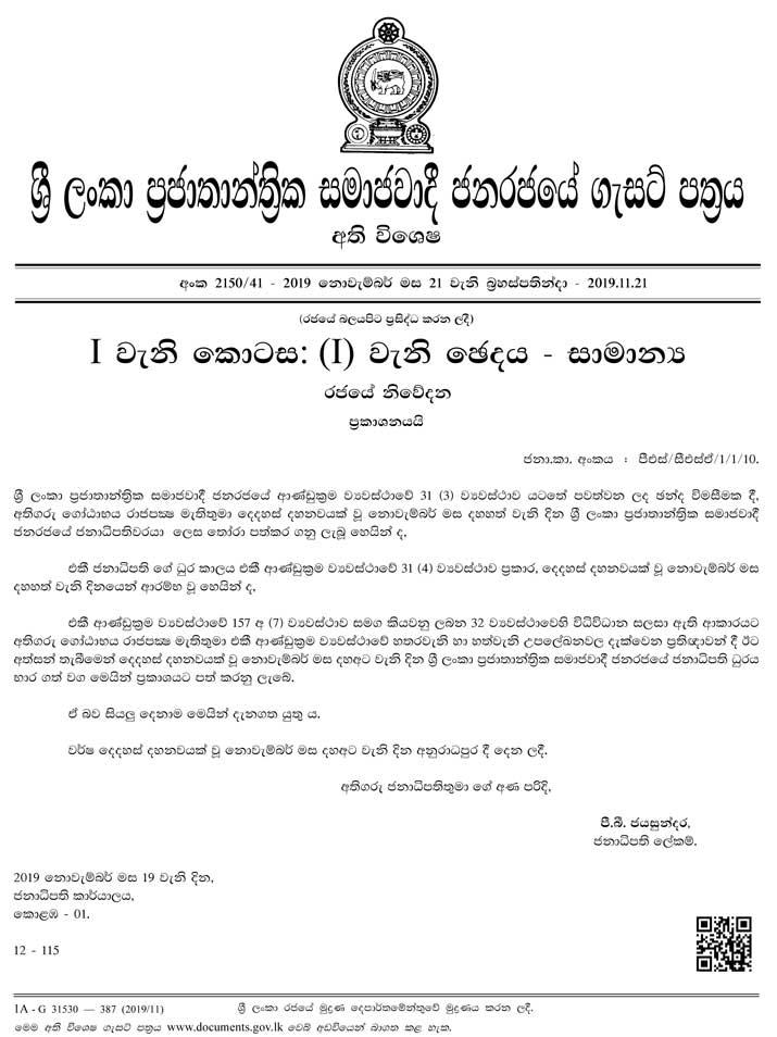 ජනපතිවරයා 2019/11/19 දා සිය ධුරයේ වැඩ භාර ගත් බවද එම අති විශේෂ ගැසට් නිවේදනයේ සඳහන් වෙයි.