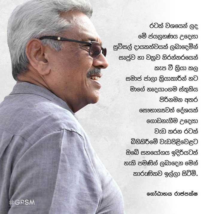 තමාගේ ජයග්රහණයට සමාජ මාධ්ය සෘජුව හා වක්රව සුවිශේෂී දායක්ත්වයක් දැක්වූ බවත් ඉදිරියේදී වැඩ කරන රටක් බිහිකිරිමේදී සමාජ මාධ්ය ක්රියාකාරීන්ගේ සහාය අපේක්ෂා කරන බවත් ජනපති ගෝඨාභය රාජපක්ෂ මහතා පවසයි.