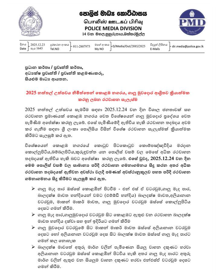 නත්තල් උත්සවය නිමිත්තෙන් කොළඹ නගරය, ගාලු මුවදොර ආශ්රිතව විශේෂිත රථවාහන සැලැස්මක් ක්රියාත්මක කරන බව පොලිස් මූලස්ථානය කියයි.