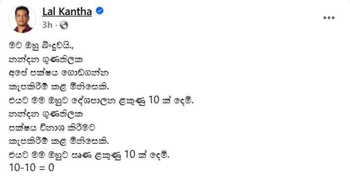 ජනතා විමුක්ති පෙරමුණේ හිටපු පක්ෂිකයෙක් වූ නන්දන ගුණතිලක මහතා අද අභාවප්රාප්ත විය. ඔහු ජවිපෙන් දේශපාලනයට පිවිසුනද පසුව පක්ෂයෙන් ඉවත්විය. ජනතා විමුක්ති පෙරමුණේ හිටපු තම සගයා සම්බන්ධයෙන් ජවිපෙ වත්මන් සාමාජිකයෙක් මෙන්ම අමාත්යවරයෙක් වන කේ.ඩී. ලාල්කාන්ත මහතා දැක්වූ අදහසයි මේ.