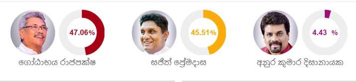 මේ වන විට නිකුත්ව ඇති ප්රතිඵල අනුව ගෝඨාභය රාජපක්ෂ මහතා වැඩි ඡන්ද 2033කින් පමණ ඉදිරියෙන් පසුවෙයි.