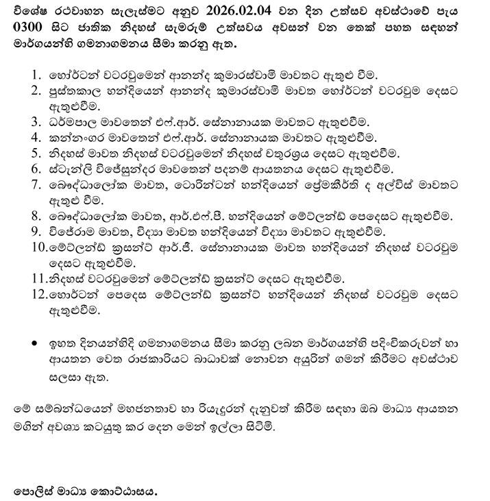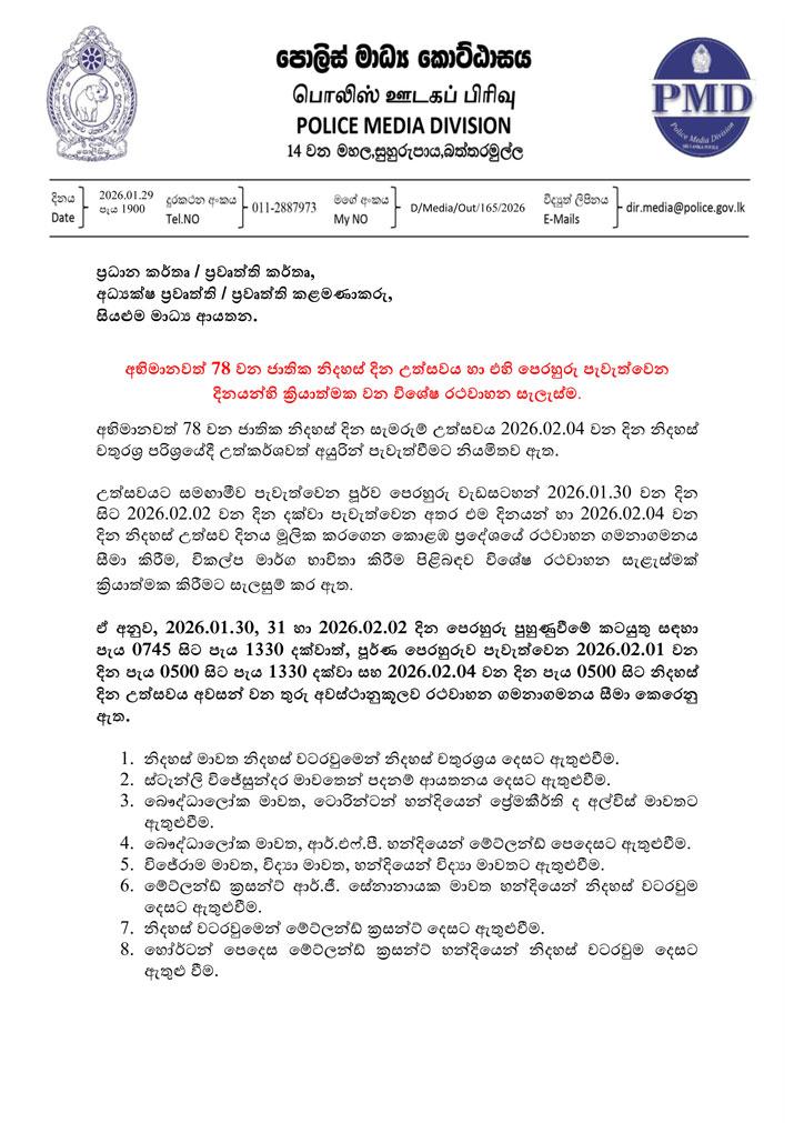 නිදහස් දින උත්සවය හා එහි පෙරහුරුව හේතුවෙන් ක්රියාත්මක විශේෂ රථ වාහන සැලැස්ම සම්බන්ධයෙන් පොලිසිය මාධ්ය දැනුවත් කිරීමේ නිවේදනයක් නිකුත් කර තිබේ.