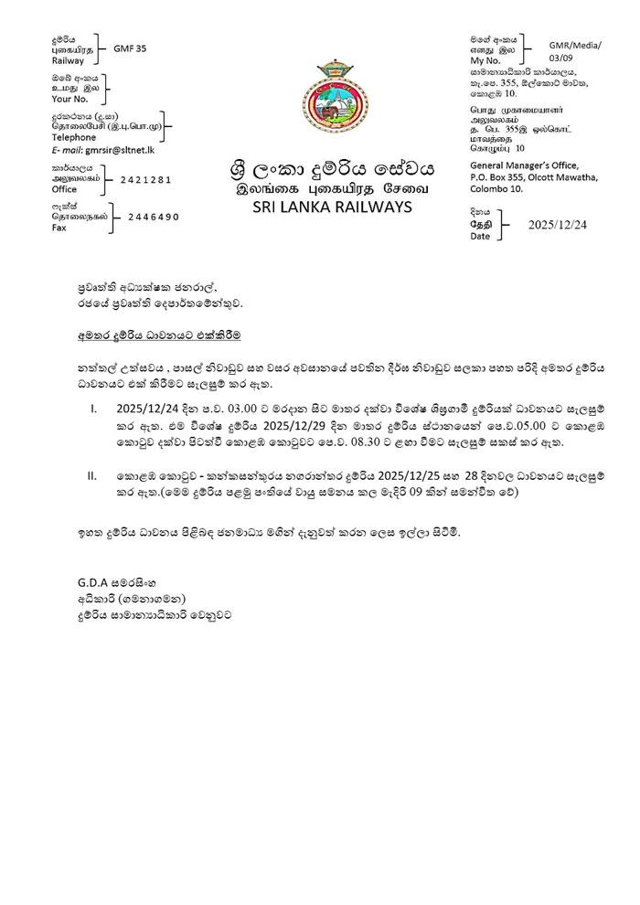 නත්තල් උත්සවය, පාසල් නිවාඩුව සහ වසර අවසානයේ පවතින දීර්ඝ නිවාඩුව හේතුවෙන් අමතර දුම්රිය ධාවනයට එක් කිරීමට දුම්රිය දෙපාර්තමේන්තුව තීරණය කර ඇති බව දුම්රිය දෙපාර්ථමේන්තුව නිවේදනයක් මගින් දන්වා සිටිනවා. අදාල නිවේදනය පහතින්
