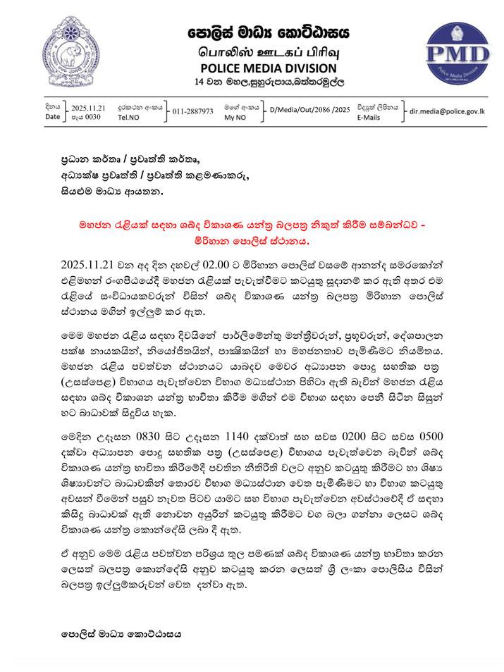 විපක්ෂයේ පක්ෂ කිහිපයක් එක්ව නුගේගොඩදී අද පස්වරුවේ පැවැත්විමට නියමිත මහජන රැළියේදී ඒ් අවට පැවෑත්වෙන උසස්පෙළ විභාග මධ්යස්ථානවලට බාධාවක් නොවන ලෙස කටයුතු කරන්නෑයි පොලීසිය අදාළ රැළියේ සංවිධායකවරුන්ට උපදෙස් දී තිබේ.