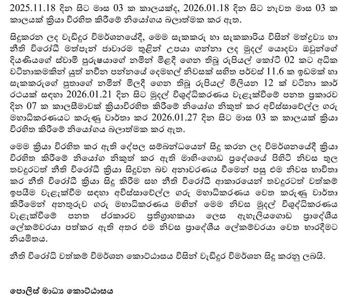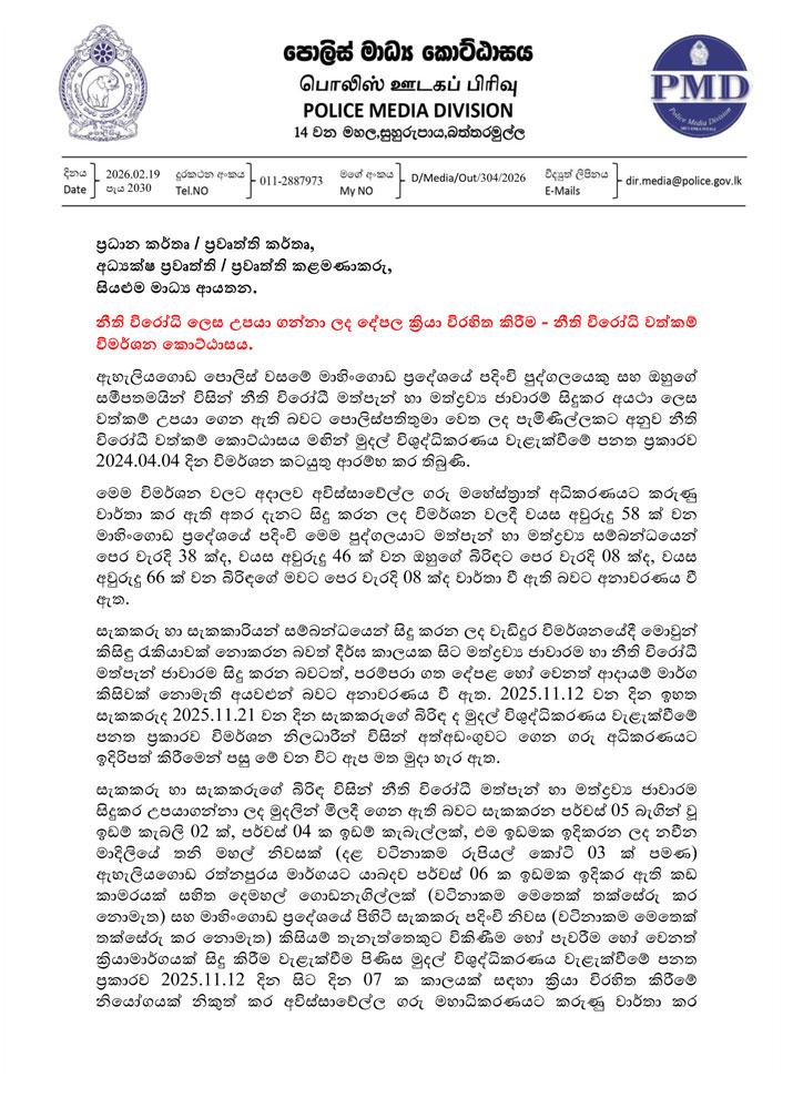 නිතිවිරෝධී මත්පැන් ජාවාරම හරහා පවුලක් විසින් උපයාගත් දේපළ ක්රියා විරහිිත කළ බව පොලීසිය කියයි. රුපියල් කෝටි ගණනක දේපළ මෙසේ ක්රියාවිරහිත කර තිබේ.