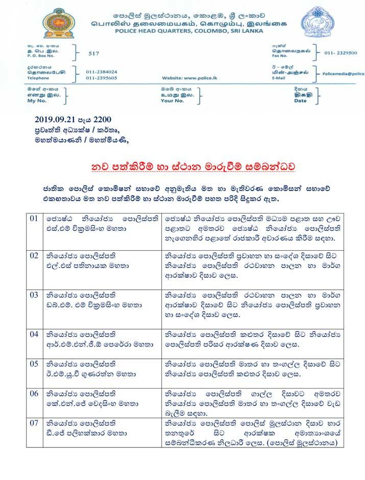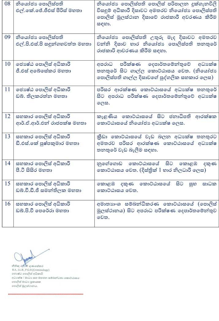 ජ්යෙෂ්ඨ නියෝජ්ය පොලිස්පති, නියෝජ්ය පොලිස්පති, ජ්යෙෂ්ඨ පොලිස් අධිකාරී, පොලිස් අධිකාරී හා සහකාර පොලිස් අධිකාරී යන තනතුරු 16ක මෙසේ වෙනස්කම් සිදුව තිබේ.
