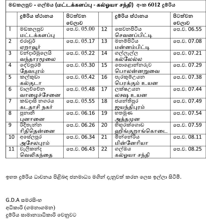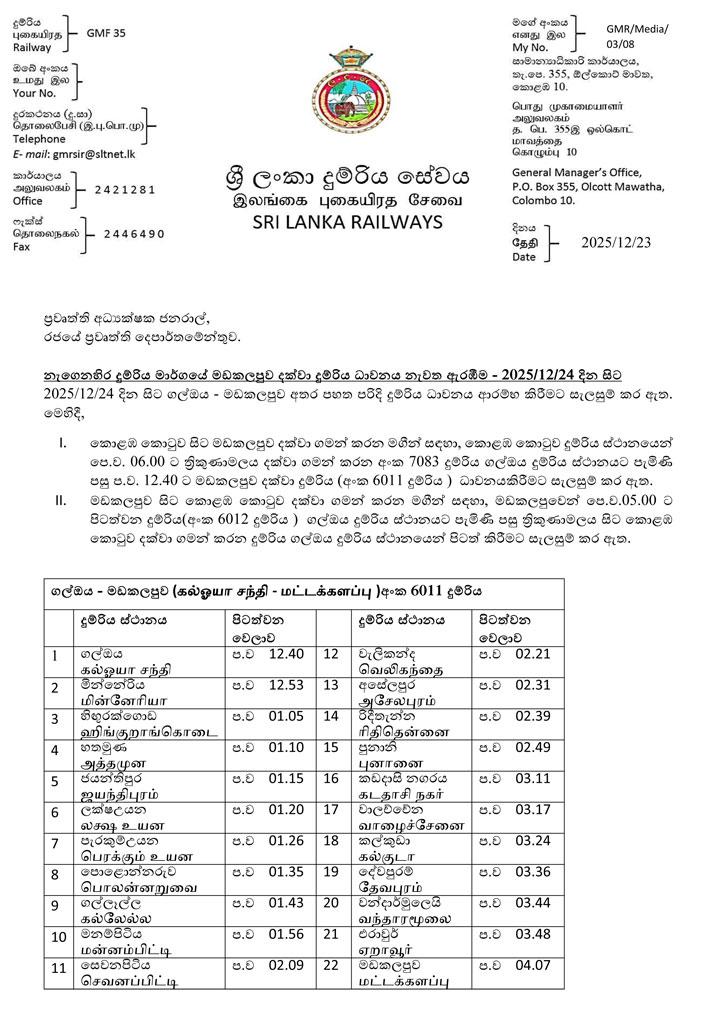 නැගෙනහිර දුම්රිය මාර්ගයේ කොළඹ කොටුවේ සිට මඩකලපුව දක්වා දුම්රිය ධාවනය හෙට (24දා) පෙරවරුවේ සිට ආරම්භ කරන බව දුම්රිය දෙපාර්තමේන්තුව නිවේදනය කරයි.