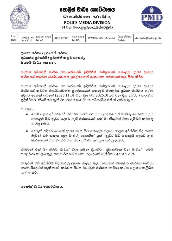 මධ්යම අධිවේගී මාර්ග ව්යාපෘතියේ ඉදිකිරීම ් හේතුවෙන් කොළඹ නුවර ප්රධාන මාර්ගයේ කඩවත බණ්ඩාරවත්ත  ප්ර දේශයෙන්  අදියර දෙකක් යටතේ (2025/11/01 දින සිට 2026/01/31 දා තෙක් ) පාලමක් ඉදිකිරීමට නියමිත හෙයින් මාර්ගයේ ඒක් මං තීරුවක් අදියර දෙකක් යටතේ වසා තැබෙන බව පොලීසිය නිවේදනය කරයි.