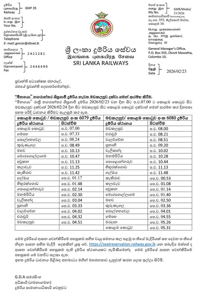 කොළඹ කොටුවේ සිට මඩකලපුව දක්වා ගමන් කරන නගරාන්තර රාත්රී සීඝ්රගාමි දුම්රිය අද දින සිට යළි ගමන් ආරම්භ කරන බව දුම්රිය දෙපාර්තමේන්තුව කියයි.
