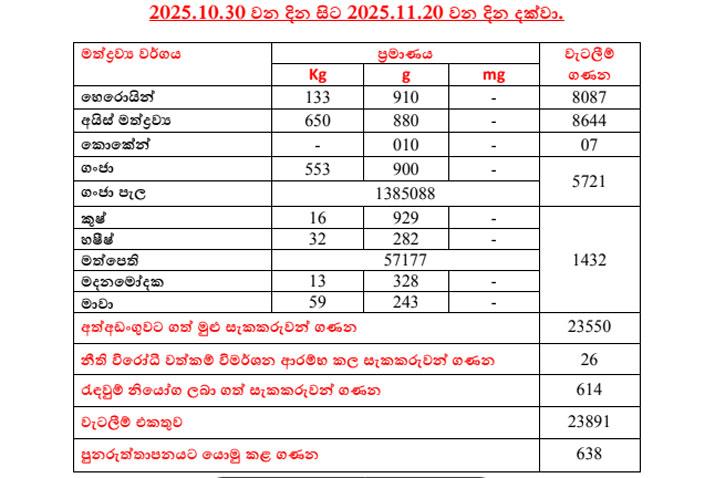 ඒසේම සිදුකර ඇති වැටලීම් සංඛ්යාව 23891කි. අයිස් මත්ද්රව්ය කිලෝ 650ක් හා හෙරොයින් කාලෝ 133ක්ද අත්අඩංගුවට ගෙන තිබේ.