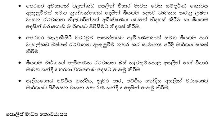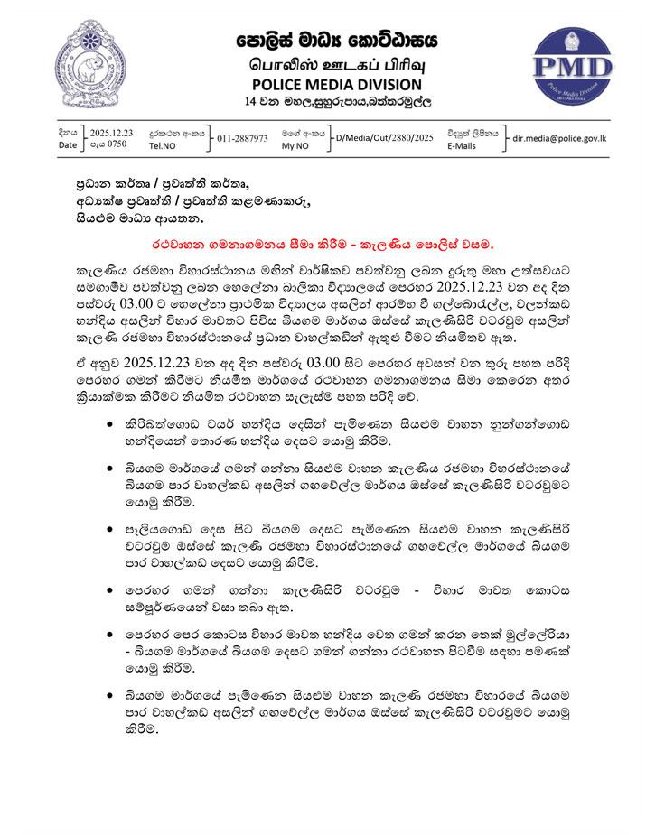 කැළණිය රාජමහා විහාරස්ථානයේ වාර්ෂික දුරුු මහා උත්සවයට සමගාමීව හෙලේනා බාලිකා විද්යාලයේ පෙරහර හේතුවෙන් මාර්ග කිහිපයක වාහන ගමනය සීමා කරන බව පොලිස් මූලස්ථානය පවසයි.