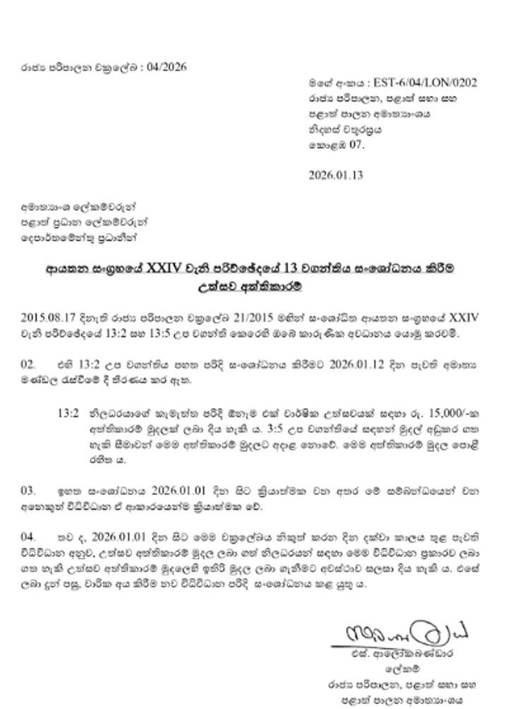 උත්සව අත්තිකාරම් සම්බන්ධයෙන් ආයතන සංග්රහයේ XXIV වැනි පරිච්ඡේදයේ 13 වගන්තිය සංශෝධනය කරමින් රාජ්ය පරිපාලන අමාත්යංශයෙන් චක්රලේඛයක් නිකුත් කර ඇත.