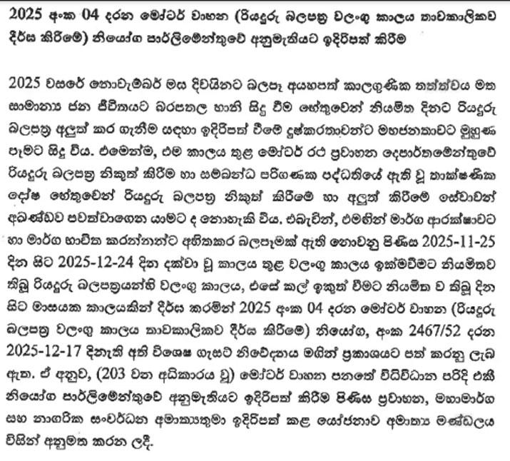 දිත්වා සුළි කුණාටුව හේතුවෙන් නියමිත දිනට රියදුරු බලපත්ර අලුත් කර ගැනිම සඳහා ඉදිරිපත් විමේ දුෂ්කරතාවන්ටමුහුණ දුන් රියදුරන් වෙනුවෙන් රියදුරු බලපත්රවල වලංගු කාලය දීර්ඝ කිරීමට කැබිනට් අනුමැතිය ලැබී තිබේ.