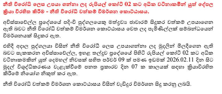 අවිස්සාවෙල්ල ප්ර දේශයේ පදිංචි පුද්ගලයෙකු මත්ද්රව්ය ජාවාරම් සිදුකර වත්කම් උපයාගෙන ඇති බවට නීති විරෝධී වත්කම් විමර්ශන කොට්ඨාසය වෙත ලද පැමිණිල්ලක් අනුව විමර්ශන කර අදාළ පුද්ගයාගේ රුපියල් කෝටි 2කට අධික වටිනාකමකින් යුත් වත්කම් ක්රියාවිරහිත කර ඇති බව පොලිසිය කියයි.