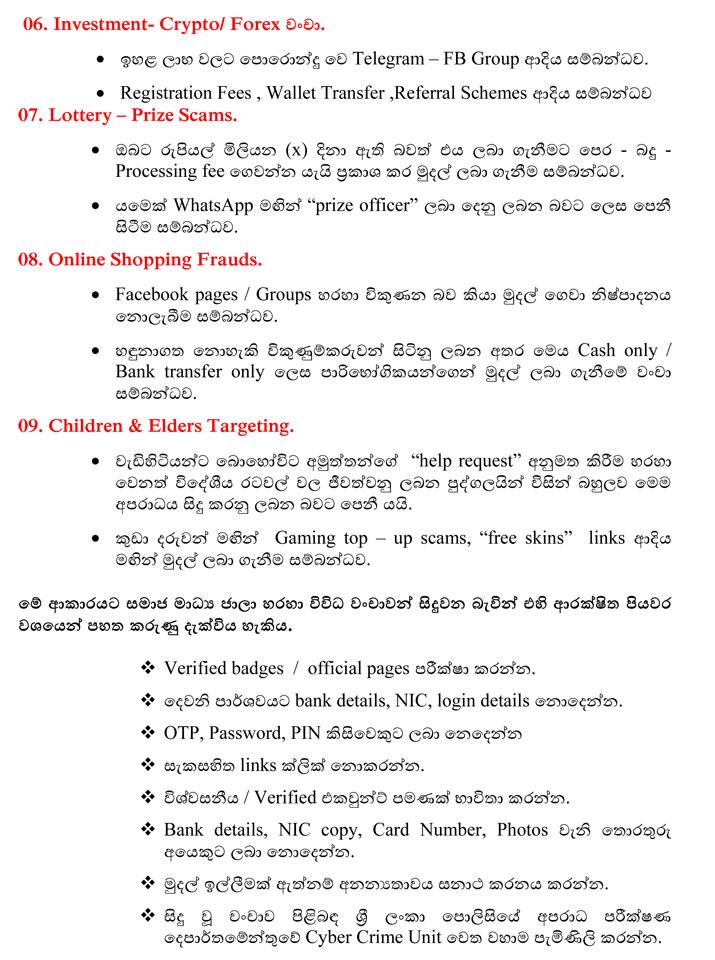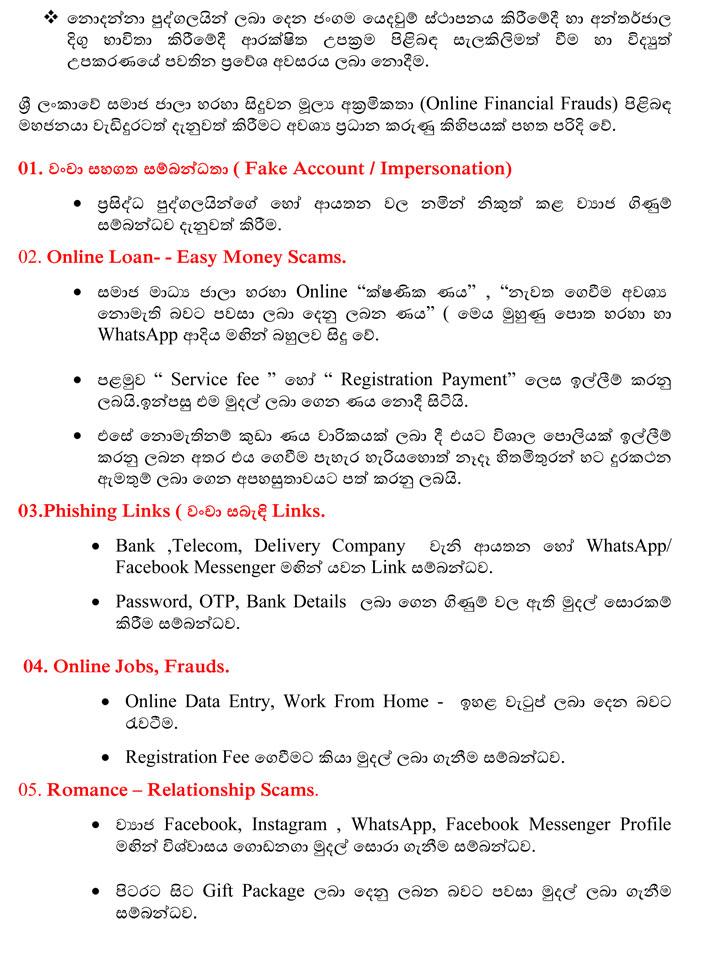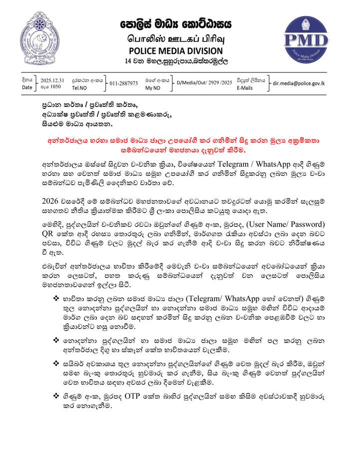 අන්තර්ජාලය හරහා සමාජ මාධ්ය ජාලා උපයෝගී කර ගනමින් සිදු කරන මූල්ය අක්රමිකතා වාර්තා වීම වැඩිව ඇති බව පොලිසිය නිවේදනයක් නිකුත් කරමින් පවසයි.