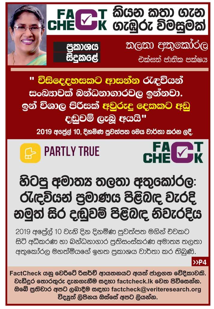 මේ අනුව අපි තලතා අතුකෝරල ඇමතිවරියගේ ප්රකාශය අර්ධ සත්යයක් ලෙස ප්රකාශ කරමු.