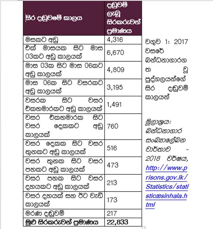 දෙවැනි ප්රකාශය: 1 වගුවෙන් පෙන්වා දී ඇති ආකාරයට 2017 වසරේ දඬුවම් ලැබ බන්ධනාගාරගත කළ සිරකරුවන් අතරින් 93%ක (21,241ක) ප්රමාණයක් වසර දෙකකට අඩු කාලයක සිර දඬුවම් ලැබූ අයයි.