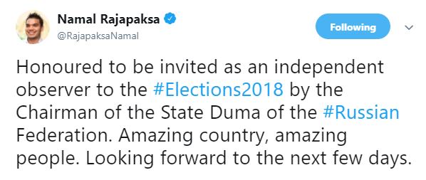 රුසියානු ජනපතිවරණයේ ස්වාධීන නීරීක්ෂකයෙක් ලෙස සම්බන්ධවිමට පාර්ලිමේන්තු මන්ත්රී නාමල් රාජපක්ෂ මහතාට අවස්ථාව හිමිව තිබේ. මන්ත්රීවරයා මේ වන විට රුසියාවට පිටත්වව ගොස් ඇත.රුසියානු පාර්ලිමෙනතුවේ (ඩුමා) සභාපතිවරයාගේ ආරාධනයෙන් මන්ත්රීවරයා මෙම අවස්ථාවට එක්ව ඇත.