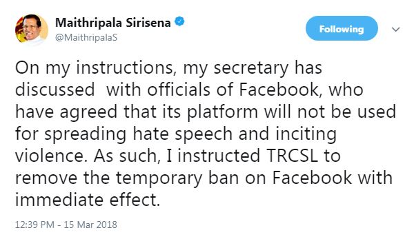 මේ සම්බන්ධව ට්වීට් පණිවුඩයක් ඉදිරිපත් කර ජනපතිවරයා පවසන්නේ, තමාගේ උපදෙස් පරිදි සිය ලේකම්වරයා විසින් ෆේස්බුක් හී නිළධාරීන් සමග සාකච්ඡා පවත්වා ඇති බවයි. එයින් අනතුරුව යළිත් ෆේස්බුක් සමාජ ජාල වෙබ් අඩවිය හරහා වෛරී ප්රකාශ හෝ ප්රචණ්ඩත්වයට තුඩු දෙන අන්දමේ ප්රකාශ වෙනුවෙන් භාවිතා නොවනු ඇති බව එම නිළධාරීන් දන්වා ඇත. එම නිසා විදුලි සංදේශ නියාමන කොමිසමට වහාම ක්රියාත්මක වන පරිදි ෆේස්බුක් වෙත පවරා තිබූ මෙම තාවකාලික තහනම ඉවත් කරන ලෙසින් දැණ්ඩූ බවද ජනපතිවරයා පවසා සිටියි.