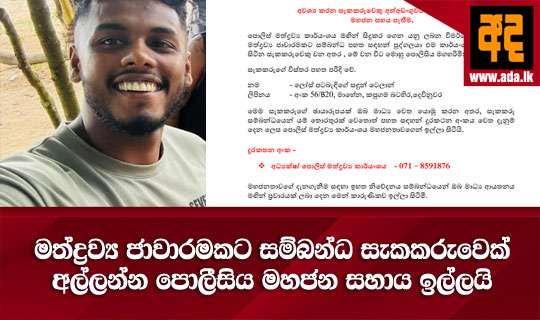 Read Moreපොලිස් මත්ද්රව්ය කාර්යාංශය මගින් සිදුකර ගෙන යන විමර්ශනයකට අදාළව මත්ද්රව්ය ජවාරමකට සම්බන්ධ සැකකරුවෙක් අත්අඩංගුවට ගැනීමට පොලිසිය මහජන සහාය ඉල්ලා සිටියි.