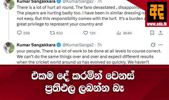 එකම දේ යළි යළිත් කර වෙනස් ප්රතිඵල අපේක්ෂා කළ නොහැකි බව ශ්රී ලංකා හිටපු නායක කුමාර් සංගක්කාර සිය ට්විටර් ගිණුමෙන් ප්රකාශයක් කරමින් පවසයි. ක්රිකට් ක්රීඩාව වේගයෙන් පරිවර්තනය වෙමින් පවතින බවත් එයට ශ්රී ලංකාව අනුවර්තනය වී නොමැති බවත් ඔහු පවසයි. ඇතිව තිබෙන ගැටලුව නිවැරදි කර ගැනීමට නම් සෑම මට්මකින් කළ යුතු වැඩ බොහෝ ඇති බව ඔහු පවසයි.