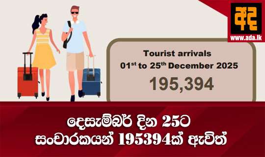 Read Moreදෙසැම්බර් 01 දා සිට 25 දා දක්වා ශ්රී ලංකාවට සංචාරකයන් 195 394ක් පැමිණ ඇති බව ශ්රී ලංකා සංචාරක සංවර්ධන අධිකාරිය පවසයි. මෙම අගයද සමගින් ජනවාරි 01 දා සිට දෙසැම්බර් 25තෙක් ශ්රී ලංකාවට පැමිණ ඇති සමස්ත සංචාරකයන් සංඛ්යාව 2 298 987 ක් බව සංචාරක සංවර්ධන අධිකාරිය පවසයි.