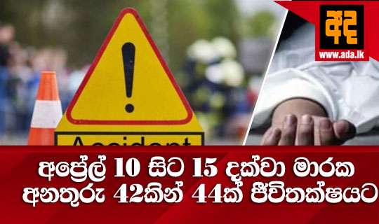 අප්රේල් 10 සිට 15 දක්වා කාලය තුළ දිවයින පුරා මාර්ග අනතුරු 42ක් වාර්තා වී පුද්ගලයින් 44 දෙනෙකු ජීවිතක්ෂයට පත්ව ඇති බව පොලිස් රථවාහන පාලන හා මාර්ග ආරක්ෂාව භාර නියෝජ්ය පොලිස්පති ඩබ්ලිව්. පී.ජේ. සේනාධීර මහතා සඳහන් කළේය.