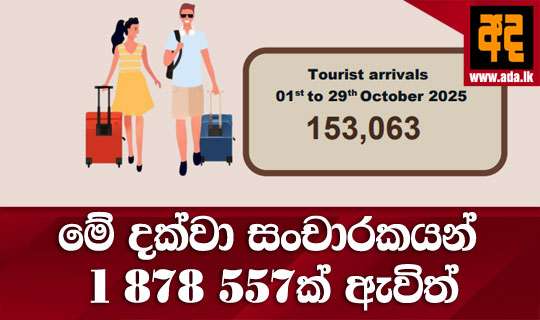 Read Moreඔක්තෝබර් මාසයේ පළමු දින 29 තුළ ශ්රී ලංකාවට සංචාරකයන් 153063ක් පැමිණ ඇති බව ශ්රී ලංකා සංචාරක සංවර්ධන අධිකාරිය පවසයි. එම සංඛ්යාවත් සමගින් මේ වසරේ ජනවාරි 01දා සිට ඔක්තෝබර් 29 දා දක්වා ශ්රී ලංකාවට පැමණ ඇති සංචාරකයන් සංඛ්යාව 1 878 557ක් බවට පත්විය.