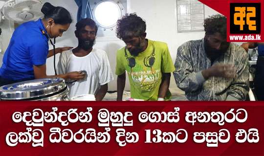 Read Moreදෙවුන්දර ධීවර වරායෙන් පසුගිය අගෝස්තු මස 31වන දින ධීවරයින් 6 දෙනෙකු සමග කේෂන් පුතා නමැති බහුදින ධීවර යාත්රාවක් මගින් ධීවර කටයුතු සඳහා පිටත්වගොස් මීට දින 15කට පමණ ඉහත දී මුහුදේ අනතුරකට ලක්ව දිවි බේරාගනු ලැබූ ධීවරයින් 4 දෙනෙකු නාවික හමුදාවට අයත් සිදුරළ නෞකාවෙන් අද (31) අලුයම 5ට පමණ හම්බන්තොට ජ්යාත්යන්තර වරායට රැගෙන එන ලදී.