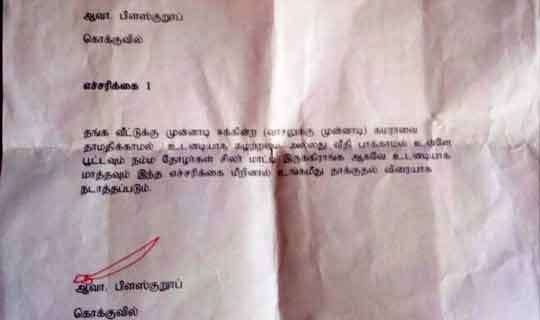 Read Moreයාපනය, කොක්කුවිල් ප්රදේශයේ පදිංචි සෙල්වරන්සන් නමැත්තෙකුගේ නිවස වෙතට ආවා කල්ලිය විසින් තර්ජනාත්මක ලිපියක් ඊයේ (03) දින එවා ඇති බව යාපනය පොලීසිය කියා සිටියි.