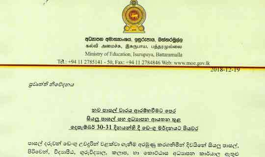 Read Moreපාසල් දරුවන් ඩෙංගු උවදුරින් වළක්වා ගැනීම අරමුණු කරගනිමින් දිවයිනේ සියලු පාසල්, පිරිවෙන්,විද්යාපිඨ, ගුරුවිද්යාල, කලාප, හා කොට්ඨාස අධ්යාපන කාර්යාල ඇතුළු අනෙකුත් අධ්යාපන ආයතනවල ඩෙංගු මර්දන වැඩසටහන් ක්රියාවට නංවන ලෙස පළාත් අධ්යාපන නිලධාරීන් දැනුවත් කිරීමට අධ්යාපන අමාත්යාංශය පියවර ගෙන තිබේ.