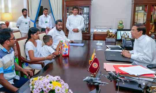 Read Moreමඩකලපුව, වව්නතිව් පොලිස් මාර්ග බාධකයේ රාජකාරියේ නිරතව සිටිය දී ඝාතනයට ලක් වූ පොලිස් සැරයන් නිරෝෂන් ඉන්දික ප්ර සන්න විරුවාගේ බිරිද, පුතණුවන් ඇතුළු පවුලේ සාමාජිකයන් අද (11) පස්වරුවේ ජනාධිපති කාර්යාලයේ දී ජනාධිපති මෛත්රීපාල සිරිසේන මහතා හමු විය.